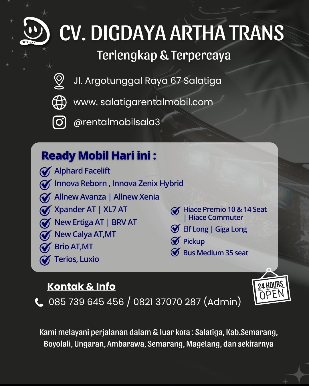 Rental mobil Salatiga Cv. Digdaya Artha Trans melayani sewa mobil wilayah Semarang, Solo, Ambarawa, Boyolali dan... selengkapnya..