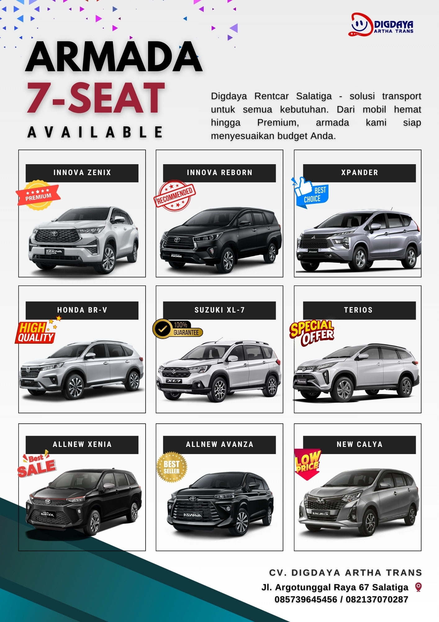 Rental mobil Salatiga Cv. Digdaya Artha Trans melayani sewa mobil wilayah Semarang, Solo, Ambarawa, Boyolali dan... selengkapnya..