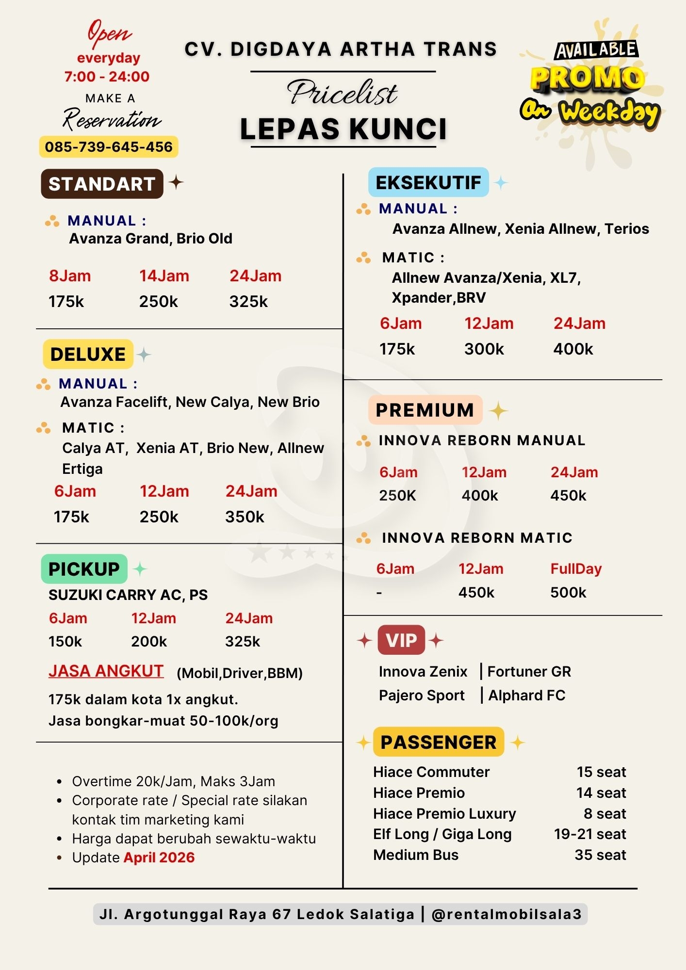 Daftar Harga sewa mobil lepas kunci periode Lebaran tgl 28-6 April 2025. Lebaran adalah momen spesial untuk berkumpul bersama keluarga.... selengkapnya..